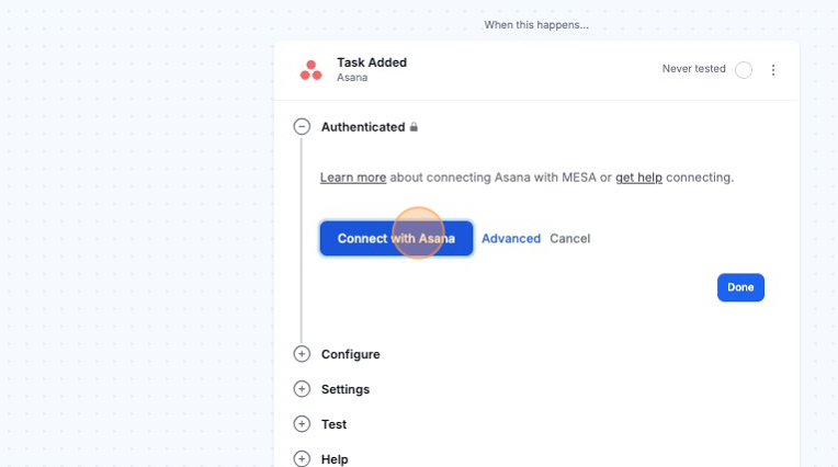 Afterwards, you will be brought back to your current workflow and you are all set! MESA is now connected with your Asana account.