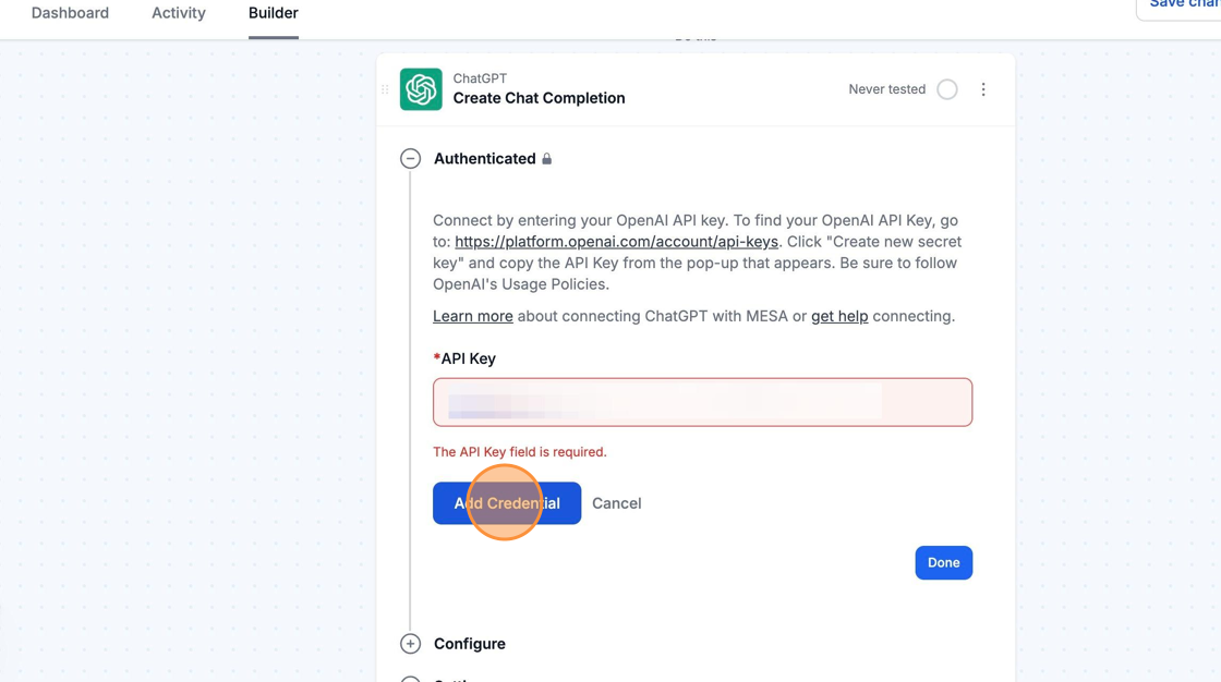 When you're setting up your first workflow with ChatGPT, you'll need to create an OpenAI **API Key**.