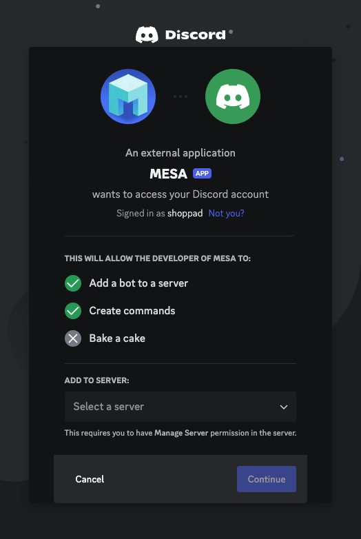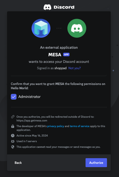 When you're setting up your first workflow with Discord, you'll need to connect your Discord account with MESA.