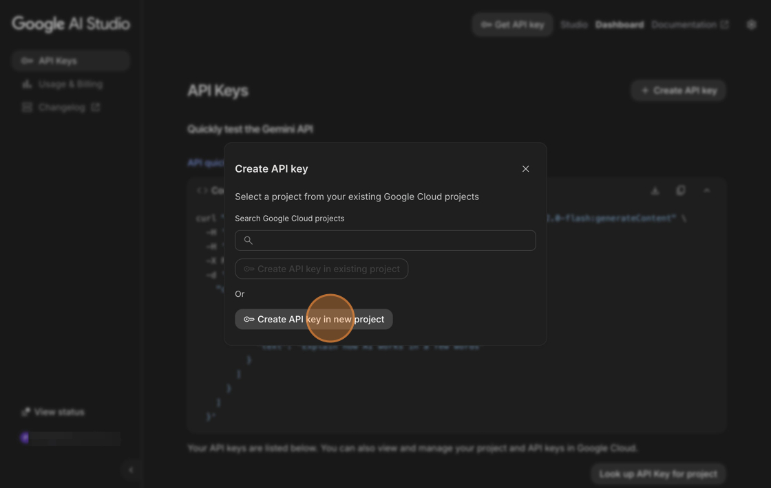Click the Create API key in new project button and copy the generated API key.