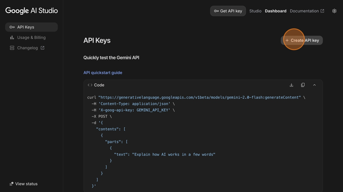 To create an API Key, go to this URL: <https://aistudio.google.com/apikey>. Once there, click on the Create API key button or select an existing key.