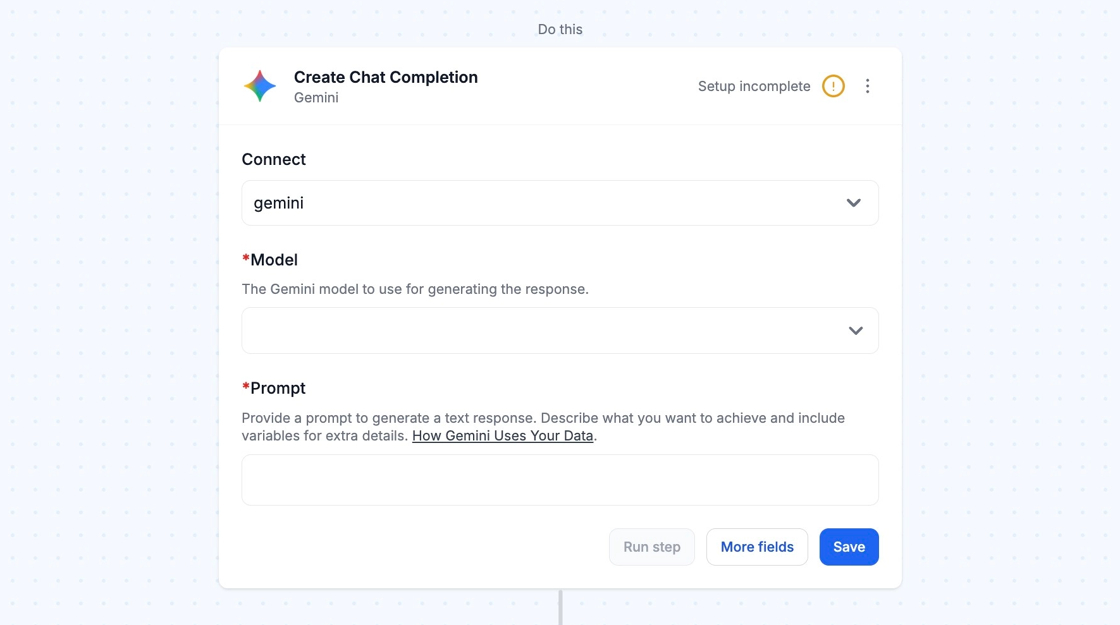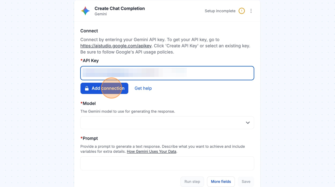 When you're setting up your first workflow with Gemini, you'll need to create an API Key.