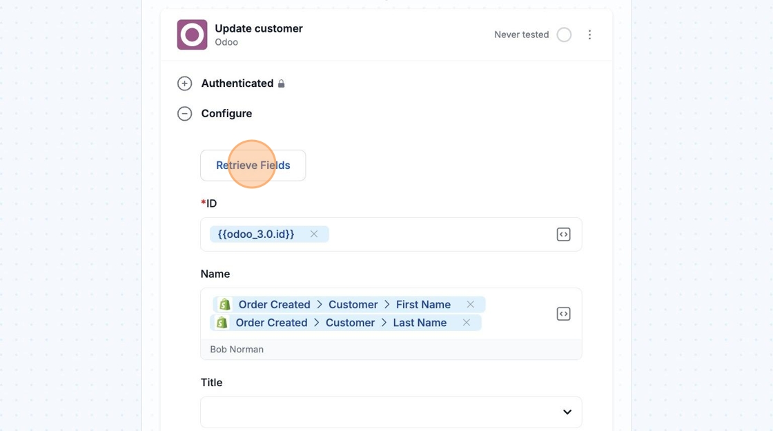 Click the Retrieve Fields button to pull in the current fields associated with your Odoo action.