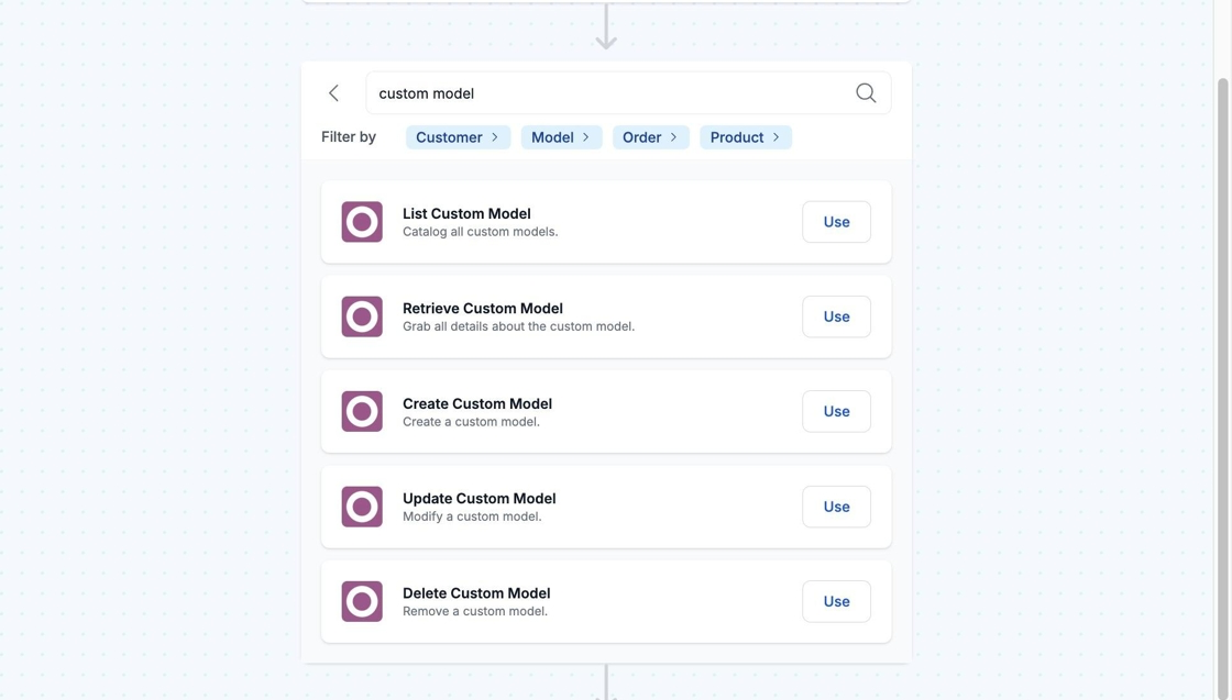 In MESA, you'll find several Odoo Custom Model actions. These are useful for working with Odoo objects that MESA doesn’t currently support as built-in actions. After selecting a Custom Model action, you can specify the object you want to interact with.