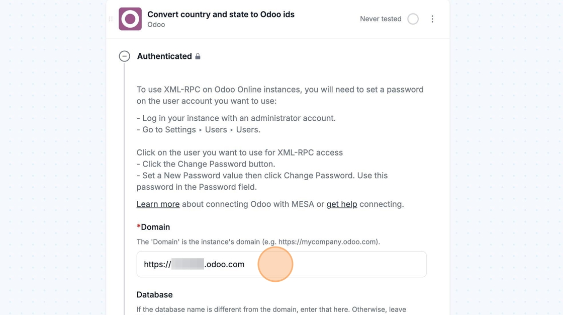 If the Odoo database name differs from the domain itself, you can enter it in the Database field of the Odoo Connection section of your Odoo step in MESA. If not, ignore that field.
