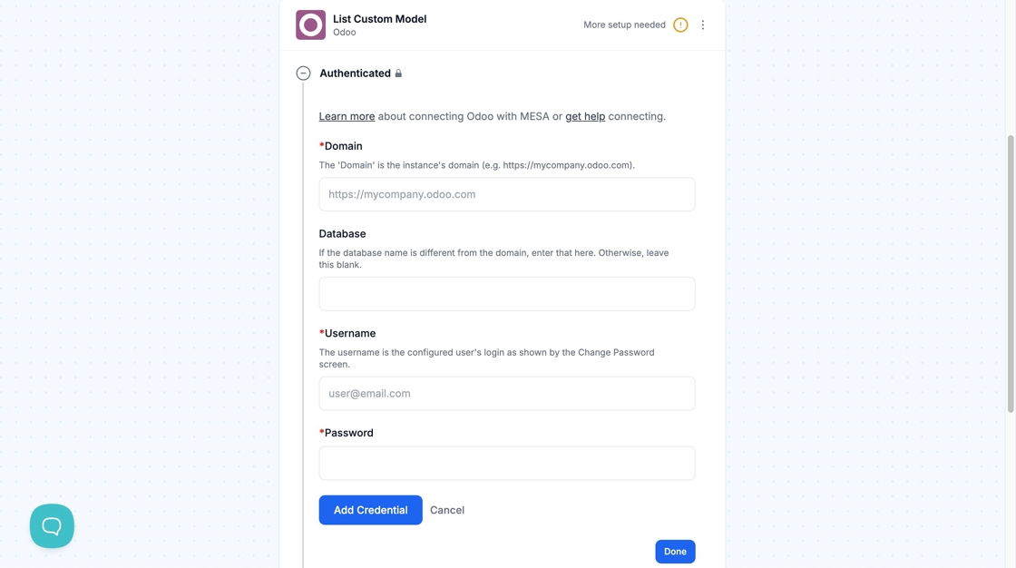 Paste your domain in the Domain field of the Odoo Connection menu of your Odoo step in MESA.