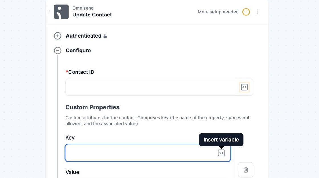 **🗒 Note**: The **Key** can be named anything as you'd like, but cannot include spaces. As a good rule, you should make the **Key** specific to the data sent to Omnisend.