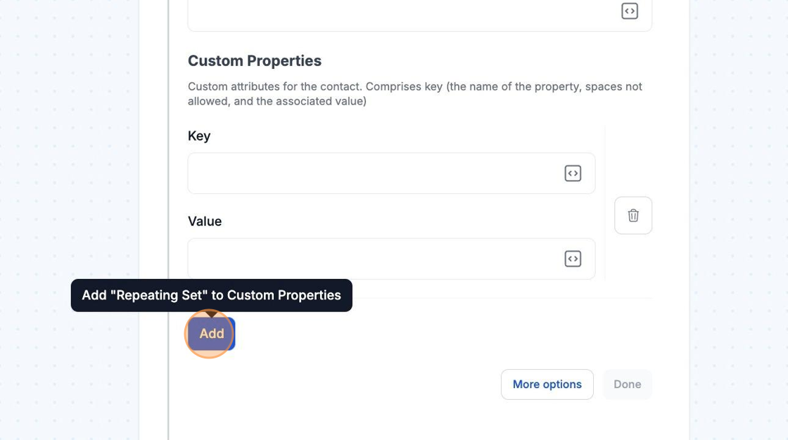 2. You can click on Add to add more custom properties that will be added to the Contact in question. Also, you can utilize [MESA's Variables feature](https://docs.getmesa.com/workflow-builder/fields/variables) to send custom data from other integrations.