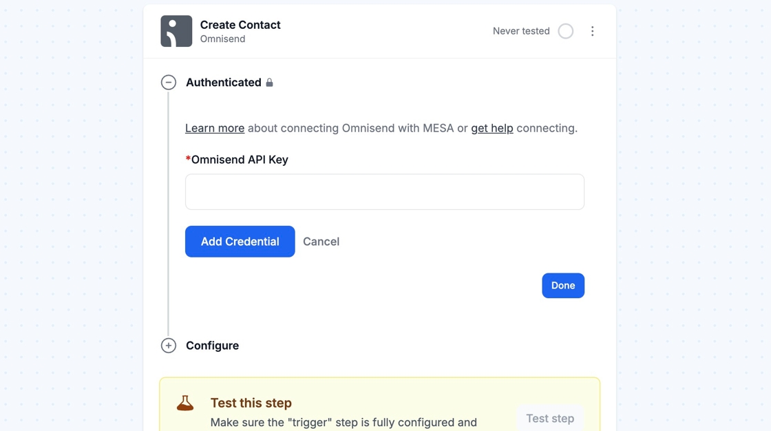 When you're setting up your first workflow with Omnisend, you'll need to add your **API key** so that Omnisend is a connected app within MESA.