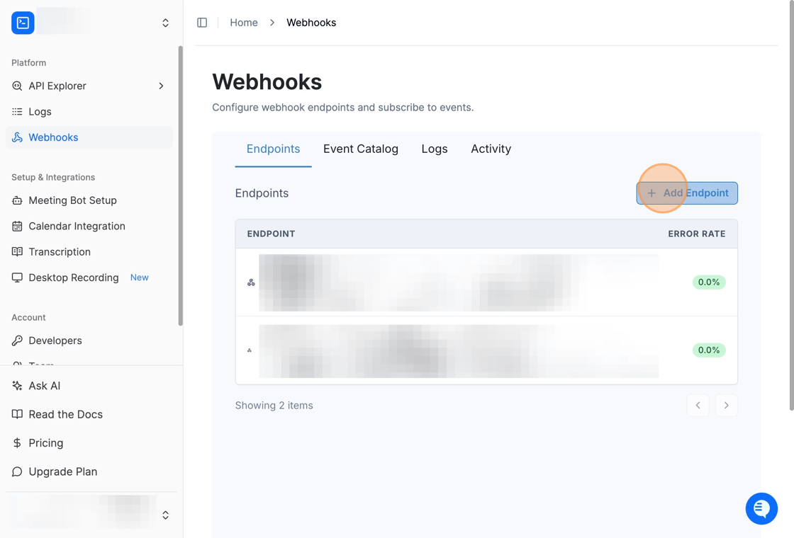 Then, in Recall, go to Webhooks under Platform and click the Add Endpoint button.