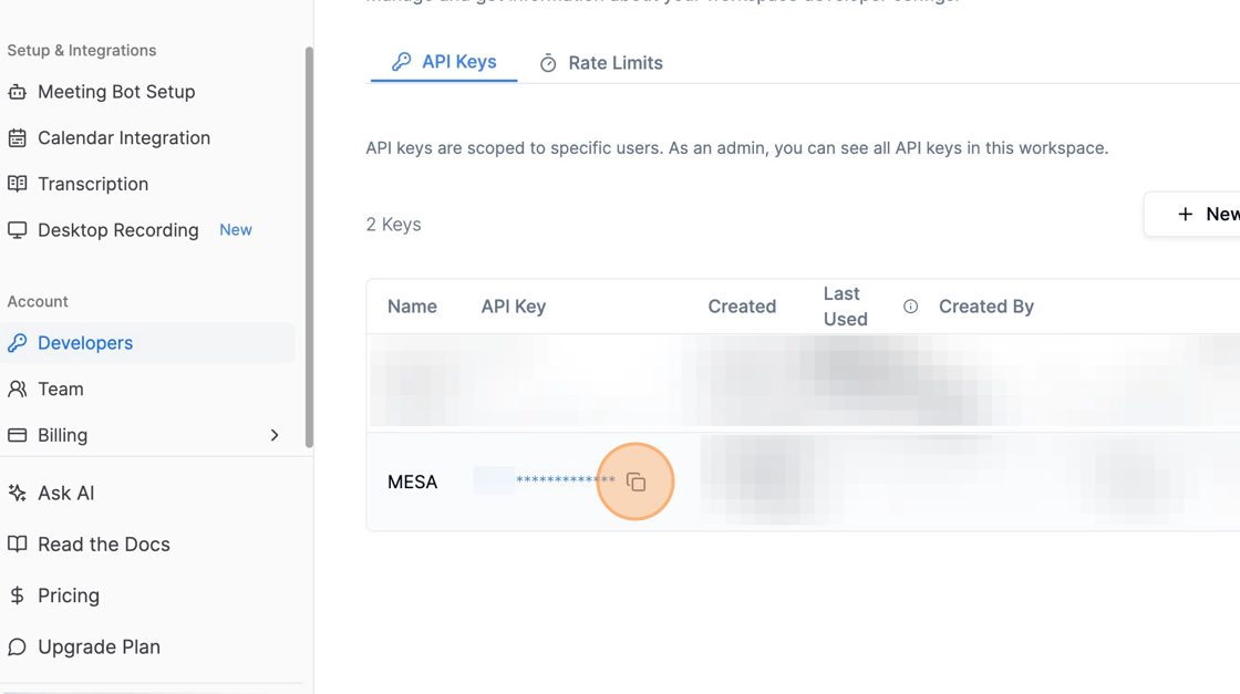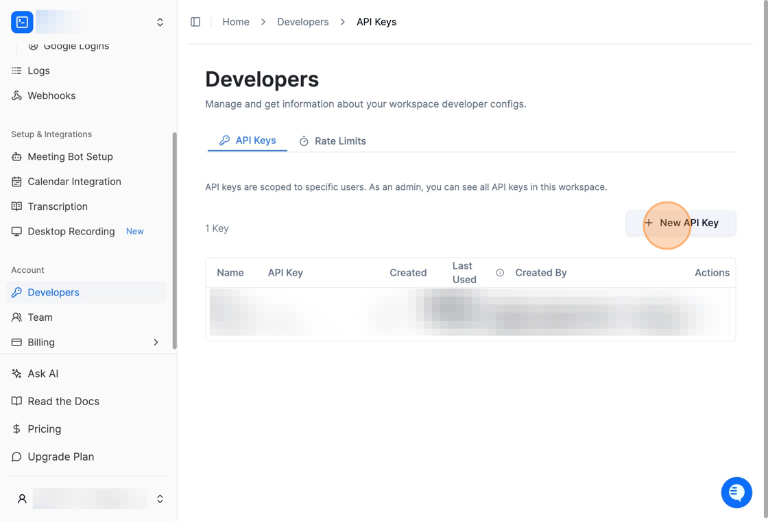 To create your connection, login to your Recall account and generate an API key by going to the Developers menu under Account and click the New API Key button.