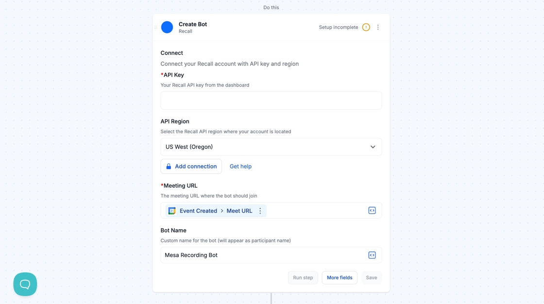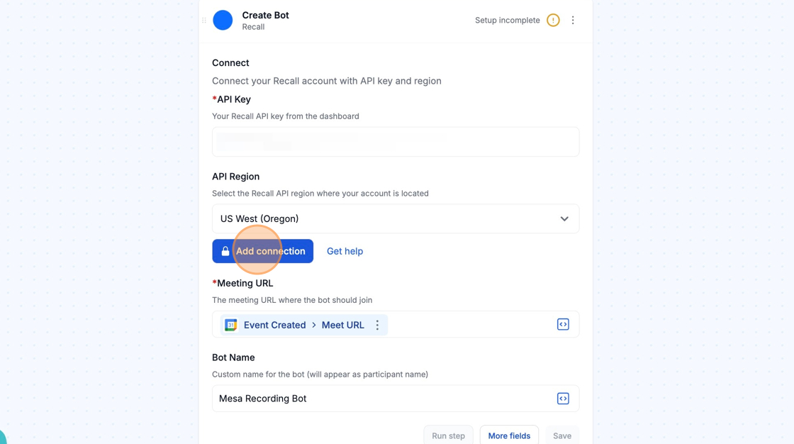 Make sure that your API Region matches the location of your Recall account and then click the Add connection button in your Recall step to complete your connection.