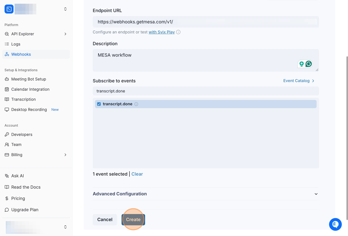 Paste the Webhook URL you copied from the trigger step in your workflow into the Endpoint URL field, add a description, and then subscribe to the `transcript.done` event and click the Create button.
