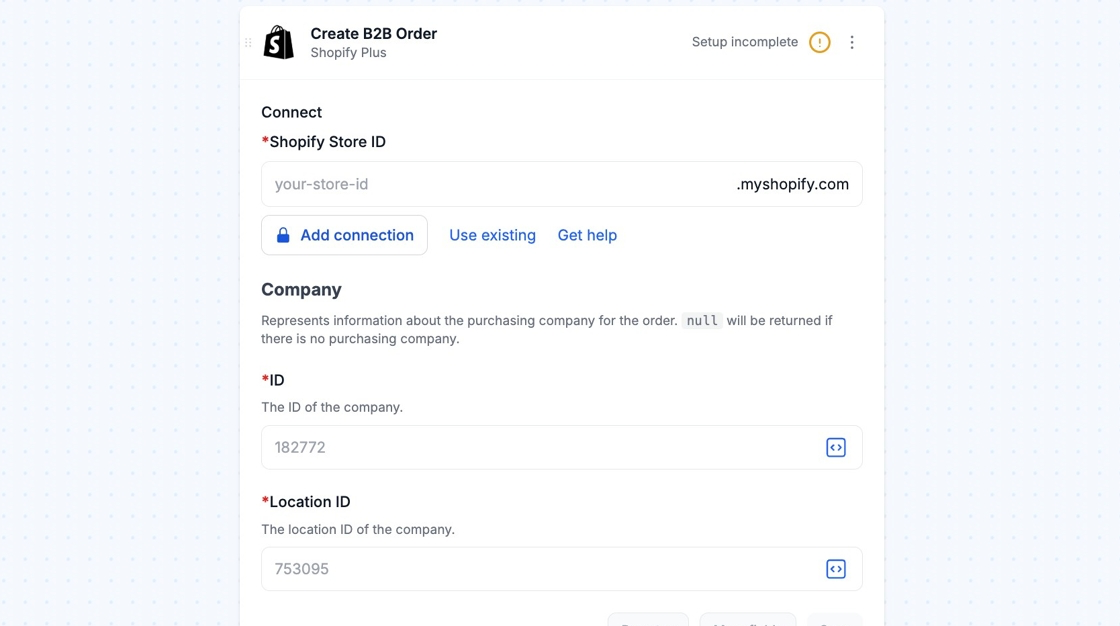 **If your workflow contains a Company-related action, you can ask Shopify Plus Support to help enable the following feature:**