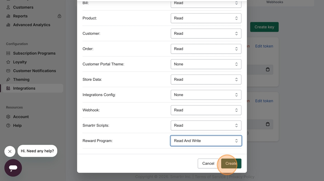 6. Scroll down to set the Reward Program dropdown menu to "Read and Write" while leaving the rest of the dropdown menus to their default, and click on the green Create button.
