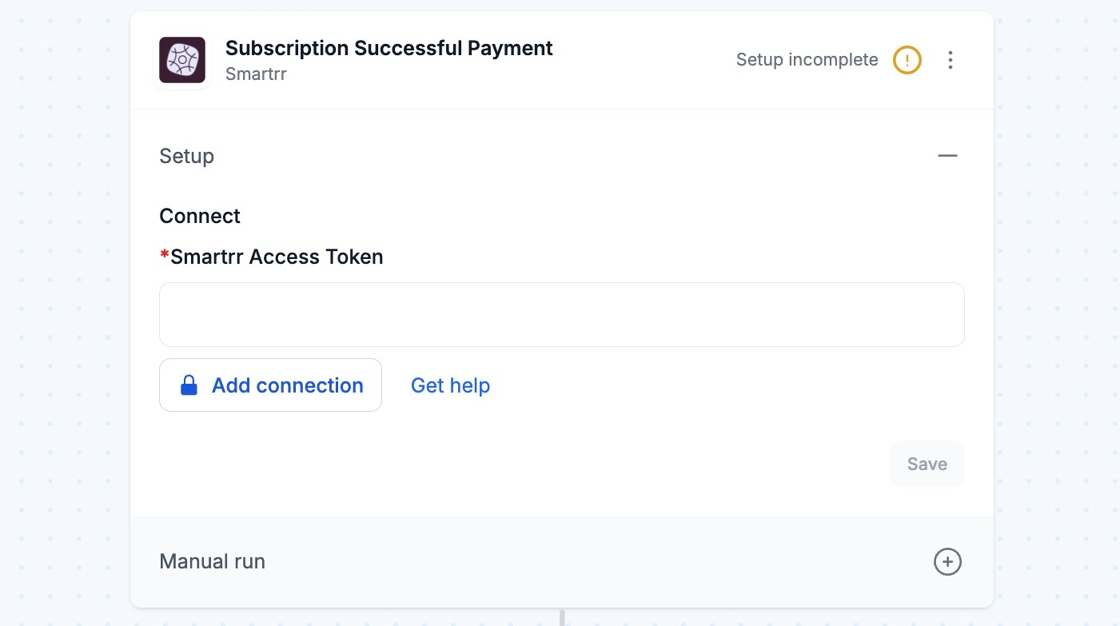 8. Go back into your MESA workflow and paste what you just copied into the Smartrr Access Token field within the Connection section. The API Key is also known as the Access Token.