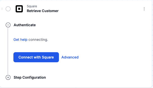 When you're setting up your first workflow with Square, you'll need to create a connection. Click on the **Connect with Square** button to finish the process.