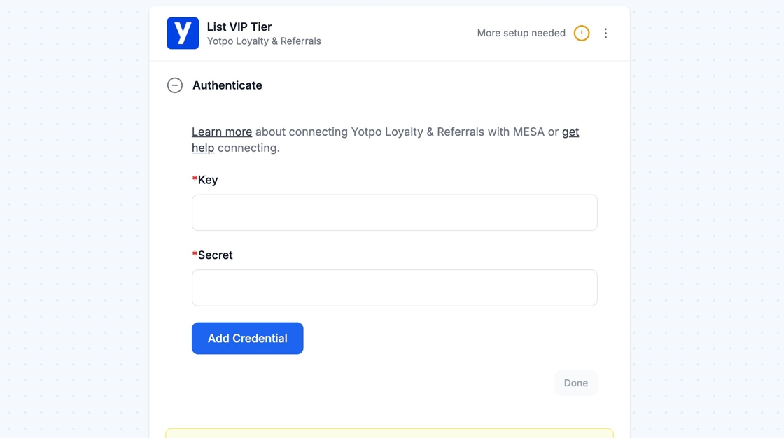 When you're setting up your first workflow with Yotpo Loyalty & Rewards, you'll need to add your unique API Key and GUID so that Yotpo Loyalty & Referrals is a connected app within MESA.