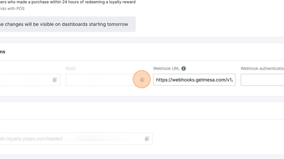 When you're setting up your first trigger for Yotpo Loyalty & Rewards, you'll need to add the Webhook URL to your Yotpo Loyalty & Rewards account, so updates are sent to MESA.