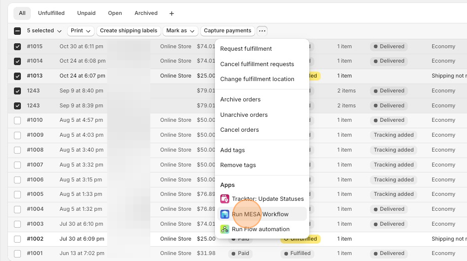 Workflows can be triggered from both the individual view and the list view in Shopify. However, the workflows must be turned on in MESA for them to run successfully. Follow the steps for Individual View to run a workflow on a single order (or other instance), and follow the steps for List View to run a workflow across multiple orders (or different instances).