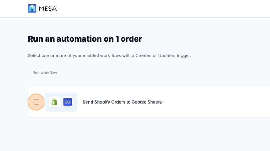 The example below will run a workflow that sends Shopify Orders to Google Sheets from the Shopify interface.