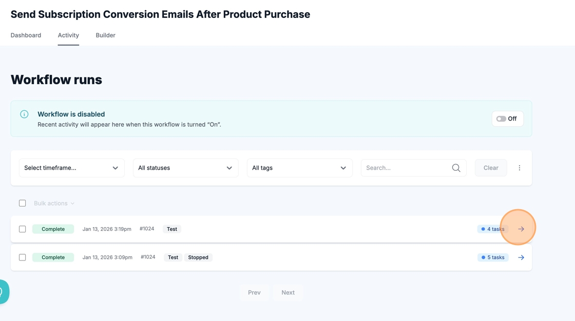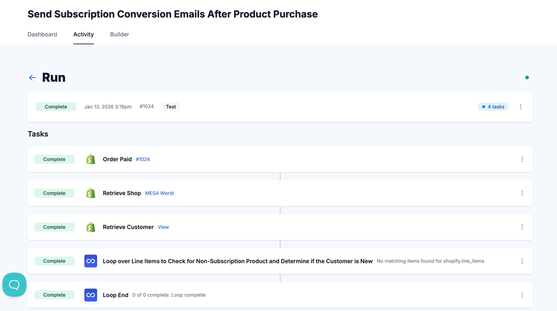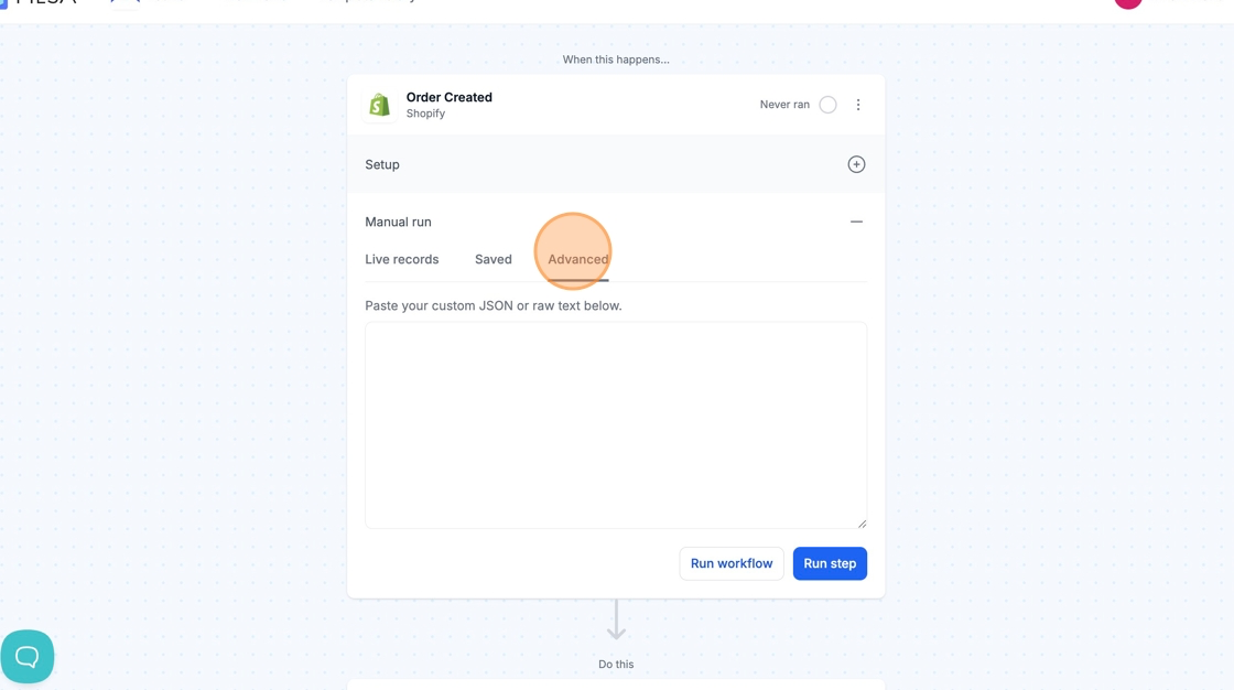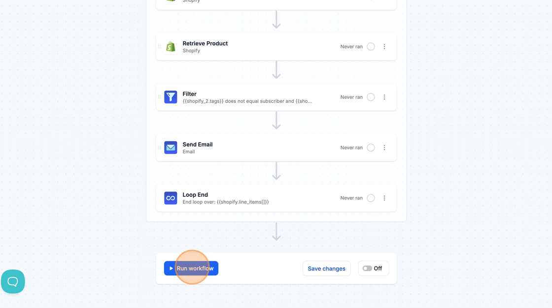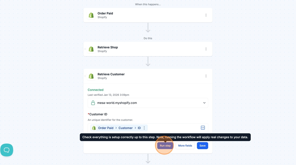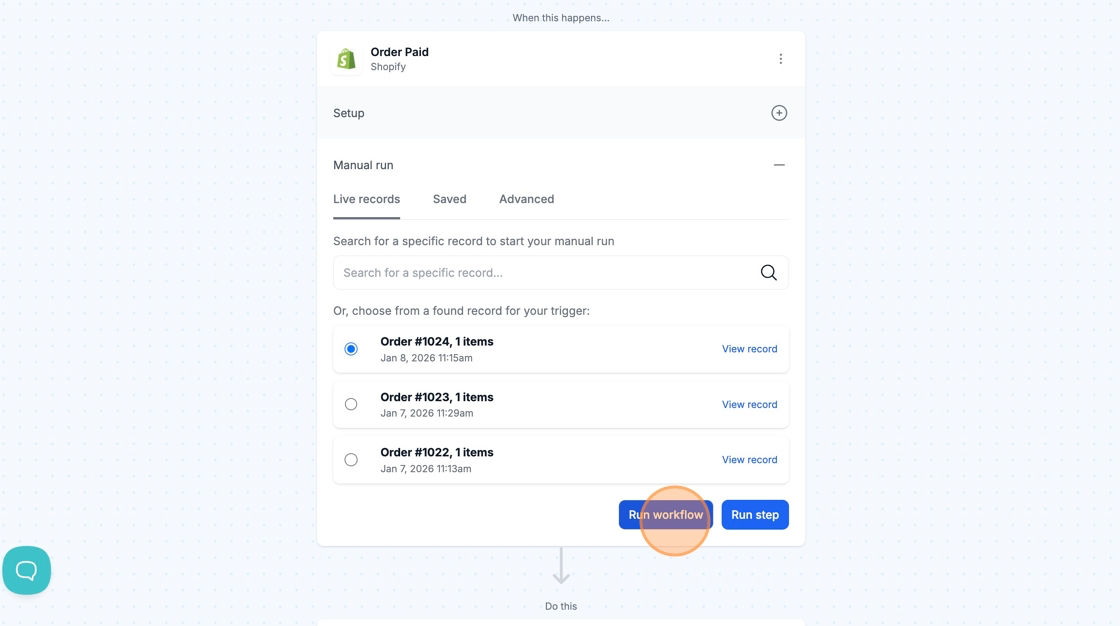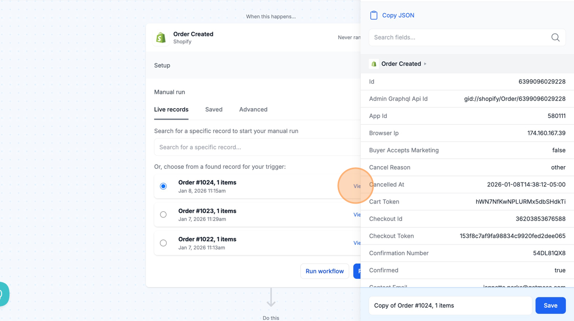 Manually running your workflow with live data allows you to see the results of your automation with real examples from your store or third-party app.