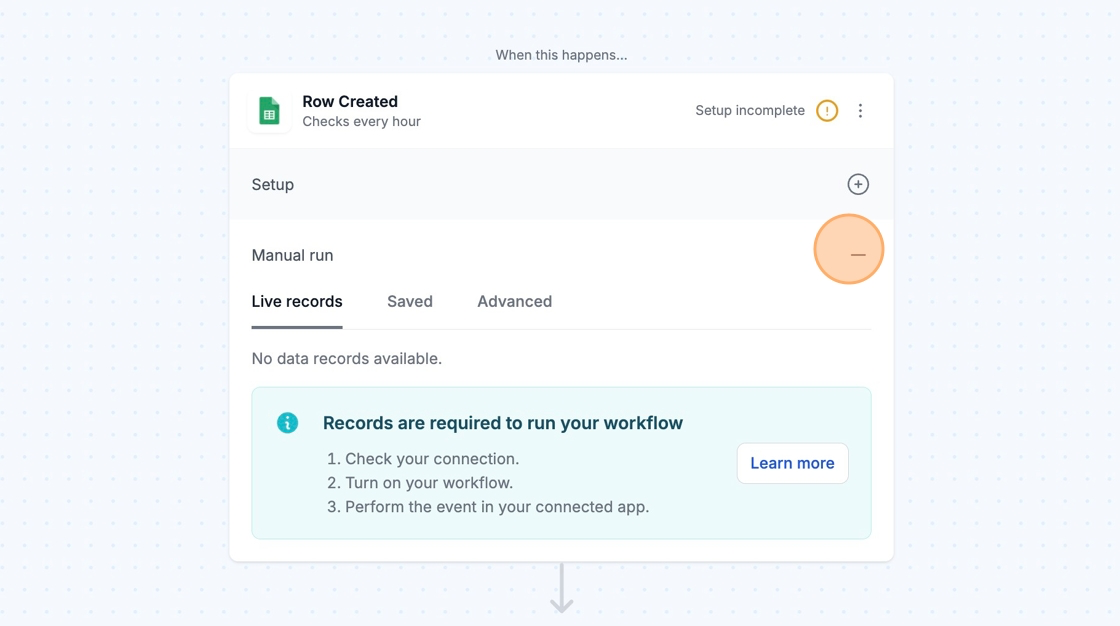 For the example in the screenshot, you would need to create a new row in your connected Google Sheet while the workflow is enabled. After doing that, check back in on the workflow to view your available record.