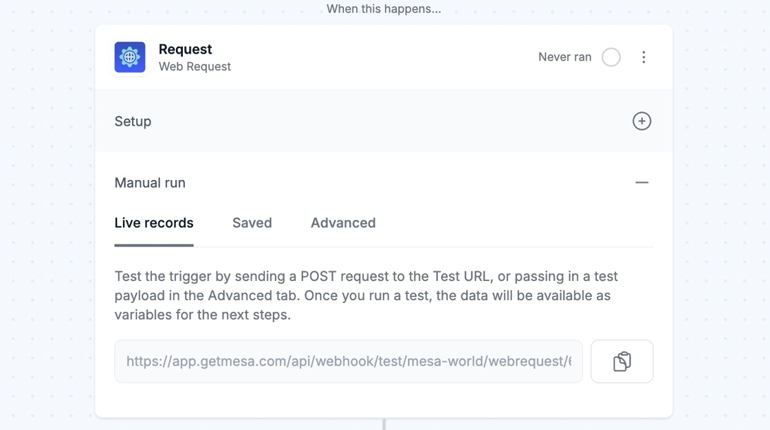You will need to send a POST request to the URL, or pass in a test payload in the Advanced tab of the Manual run menu. Once you conduct a manual run, the data will be available as variables for the next steps.