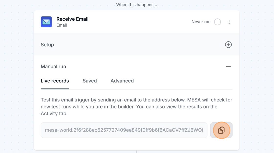 You can manually run the Email trigger by sending an email to the custom MESA email address associated with your step in the **Manual run** submenu while your workflow is enabled.