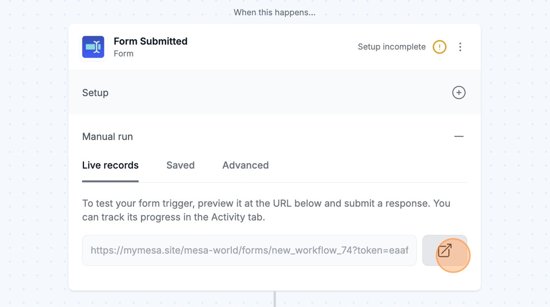 To conduct a manual run for your Forms workflow, make sure that you enable your workflow. Locate the **Form URL** field and click on the external link icon to view your Form. Then, make a test submission.